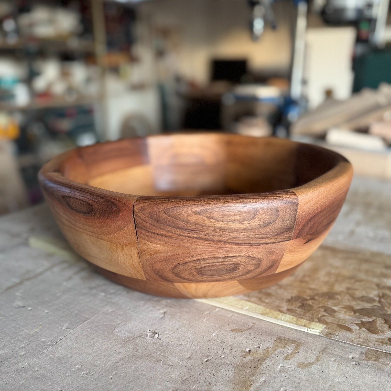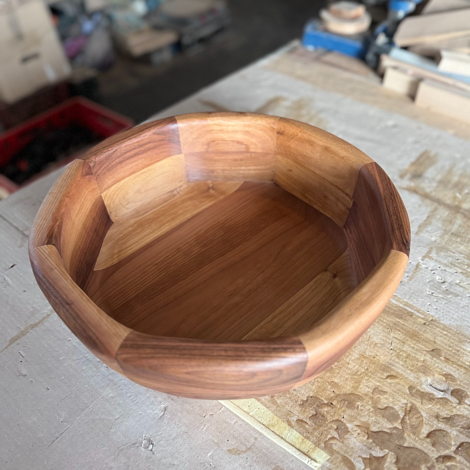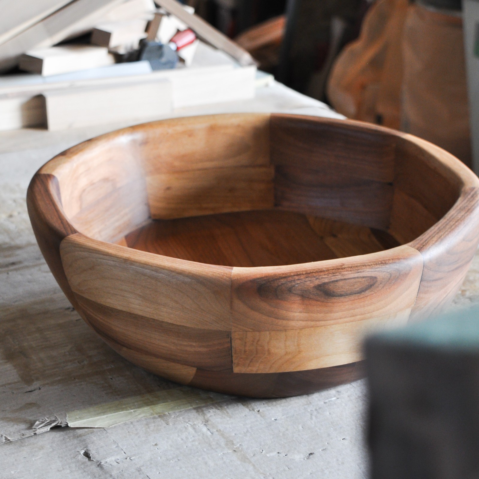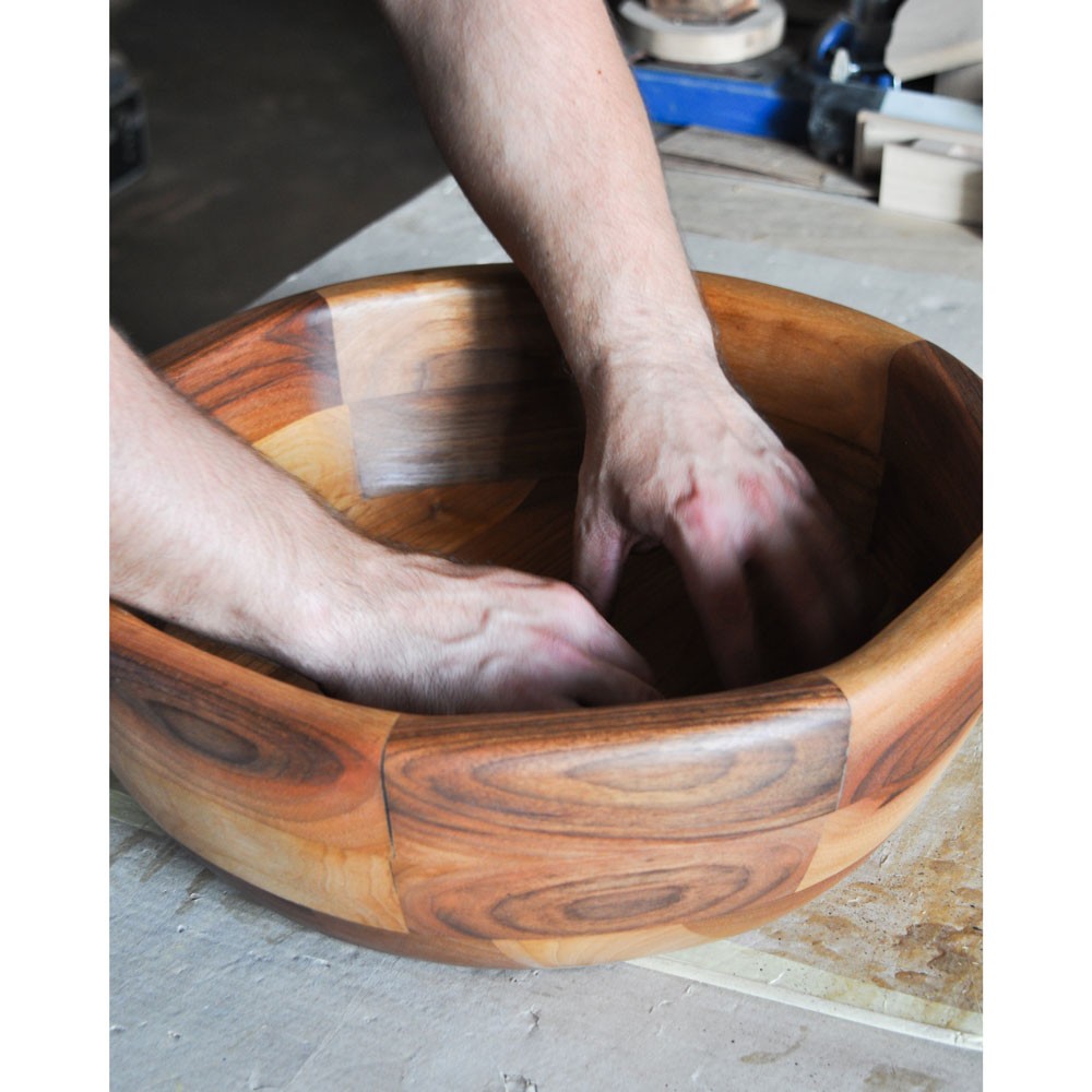 Okrugla činija napravljena je orahovog drveta i inicijalno namenjena za pripremu testa. Činija je napravljena iz segmenata koji su spajani lepkom sertifikvanim za kontakt sa hranom. Završno je impregnirana uljem koje je u potpunosti bezbedno za kulinarsku upotrebu. Ulje štiti drvo, čuva njegovu boju i naglašava prirodnu teksturu oraha. Masivna konstrukcija, debeli zidovi i širina čine je izuzetno stabilnom i dugotrajnom — pravljena je da se koristi godinama. Spoljni prečnik činije je 44 cm, a visina je oko 14 cm. Debljina zidova je oko 2,5 cm, a dna oko 3. Materijal korišćen za izradu je tamni (pareni) orah. Da bi činija ostala u savršenom stanju: - ne prati je u mašini za sudove - ne ostavljati u vodi duže vreme - prati toplom vodom i blagim deterdžentom i odmah obrisati - povremeno premazati uljem za tu namenu Čuvati na suvom mestu, dalje od direktnog izvora toplote.